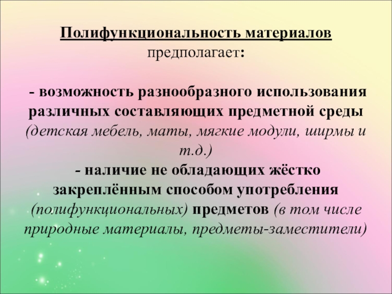- наличие не обладающих жёстко закреплённым способом употребления (полифункциональных) предметов (в том числе природные материалы, предметы-заместители)