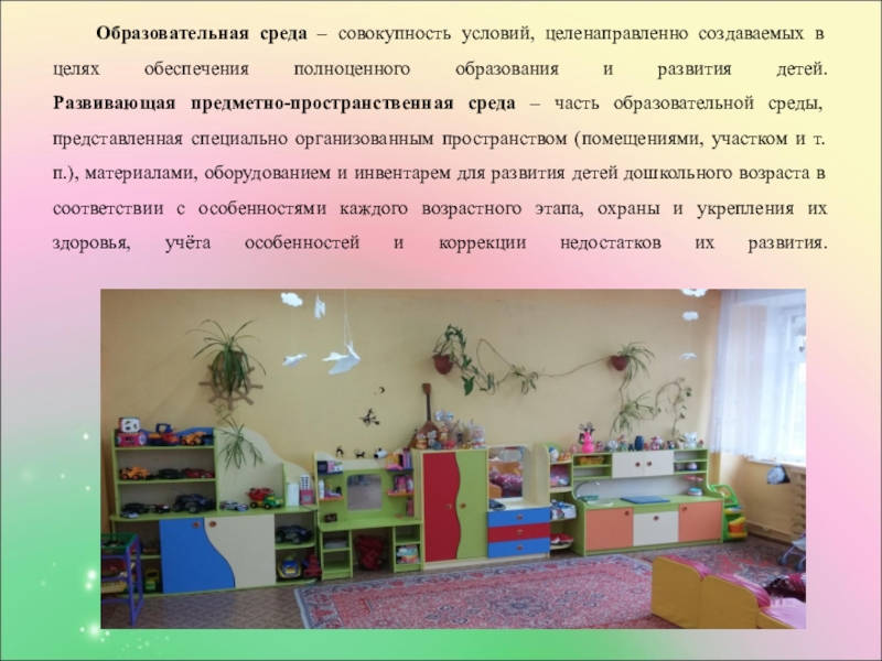 Развивающая предметно-пространственная среда – часть образовательной среды, представленная специально организованным пространством (помещениями, участком и т.п.), материалами, оборудованием и инвентарем для развития детей дошкольного возраста в соответствии с особенностями каждого возрастного этапа, охраны и укрепления их здоровья, учёта особенностей и коррекции недостатков их развития.