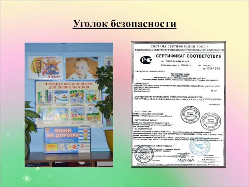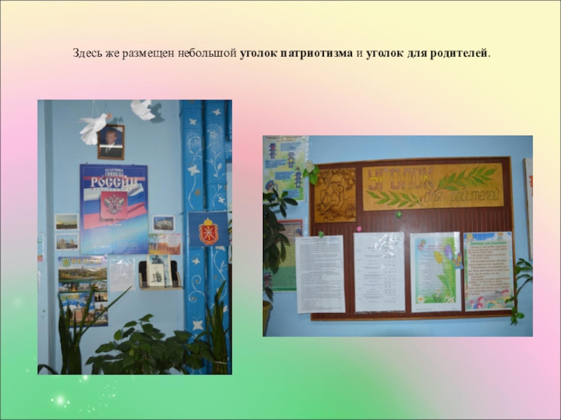 Здесь же размещен небольшой уголок патриотизма и уголок для родителей.