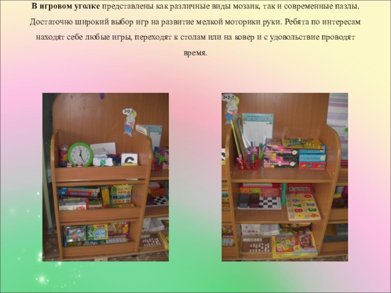 В игровом уголке представлены как различные виды мозаик, так и современные пазлы.