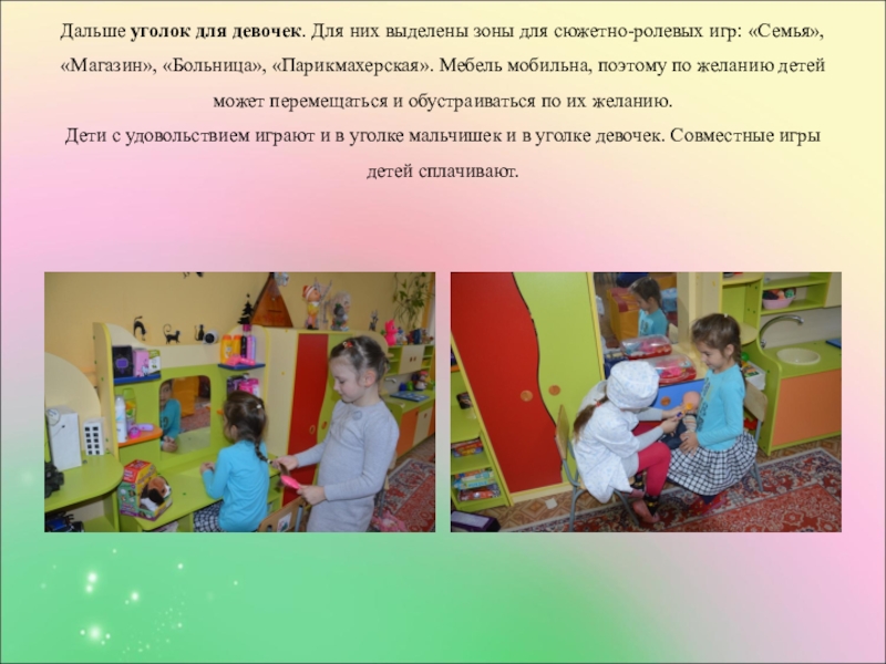 Дальше уголок для девочек. Для них выделены зоны для сюжетно-ролевых игр: