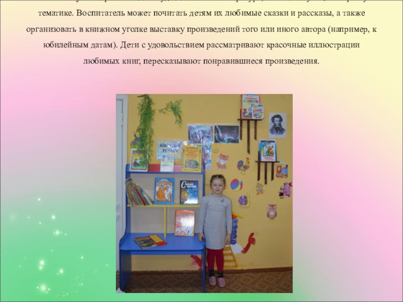 В книжном уголке расположена художественная литература, соответствующая возрасту и тематике. Воспитатель
