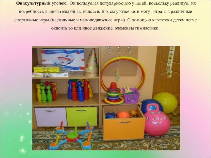 в двигательной активности. В этом уголке дети могут играть в различные спортивные игры (настольные и малоподвижные игры). С помощью картотеки детям легче освоить то или иное движение, элементы гимнастики.