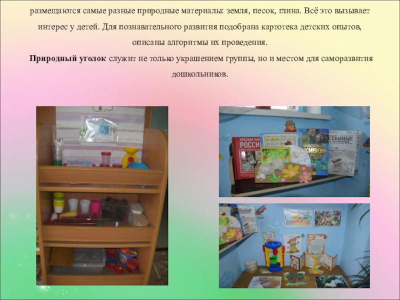 природные материалы: земля, песок, глина. Всё это вызывает интерес у детей. Для познавательного развития подобрана картотека детских опытов, описаны алгоритмы их проведения.