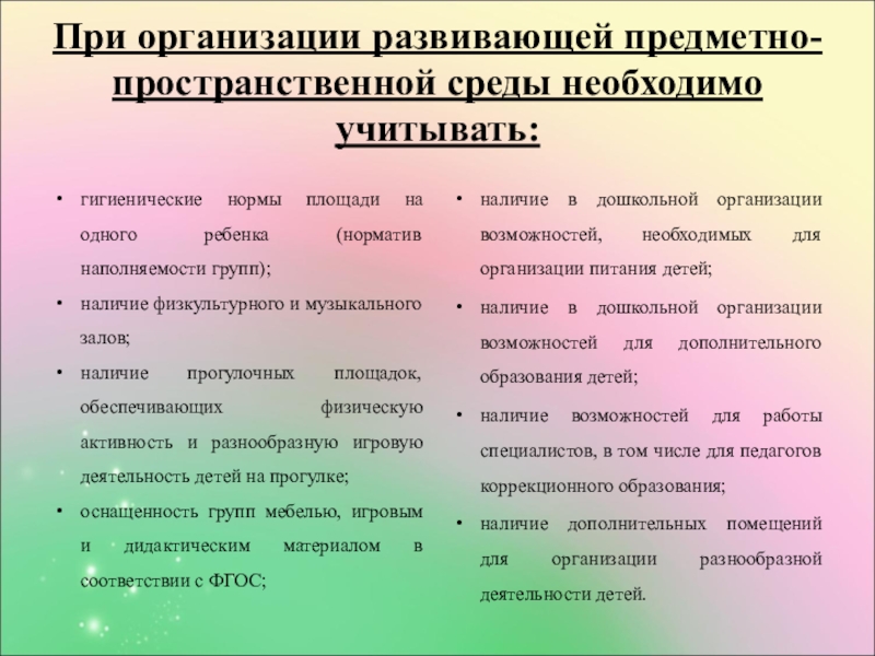 При организации развивающей предметно-пространственной среды необходимо учитывать: