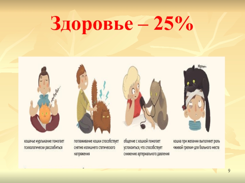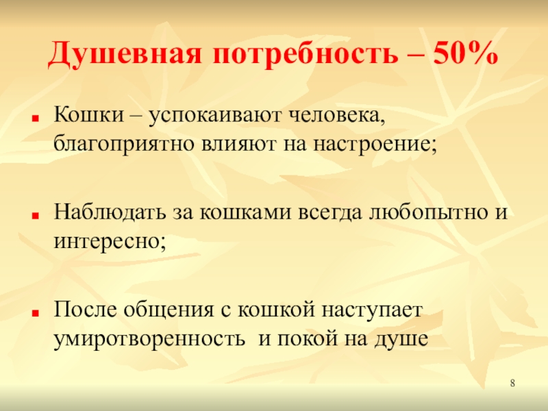 Душевная потребность – 50%Кошки – успокаивают человека, благоприятно влияют на настроение;Наблюдать за кошками всегда любопытно и интересно;После
