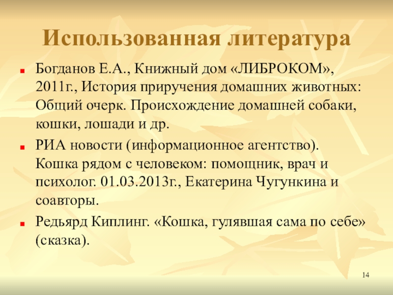 Использованная литератураБогданов Е.А., Книжный дом «ЛИБРОКОМ», 2011г., История приручения домашних животных: Общий очерк. Происхождение домашней собаки, кошки,
