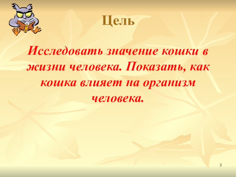 ЦельИсследовать значение кошки в жизни человека. Показать, как кошка влияет на организм человека.