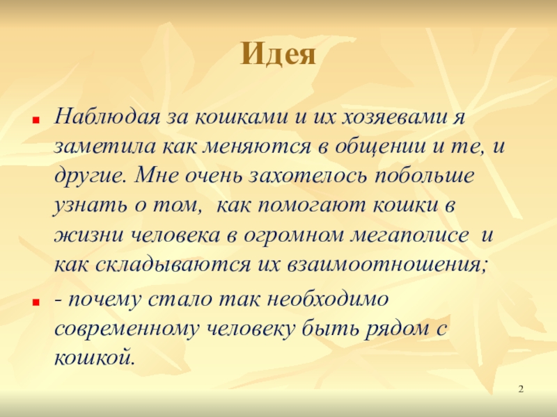 ИдеяНаблюдая за кошками и их хозяевами я заметила как меняются в общении и те, и другие. Мне очень захотелось побольше узнать о том, как помогают кошки в жизни человека в огромном мегаполисе и как складываются их
