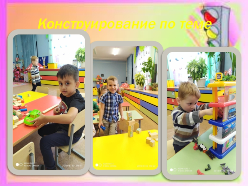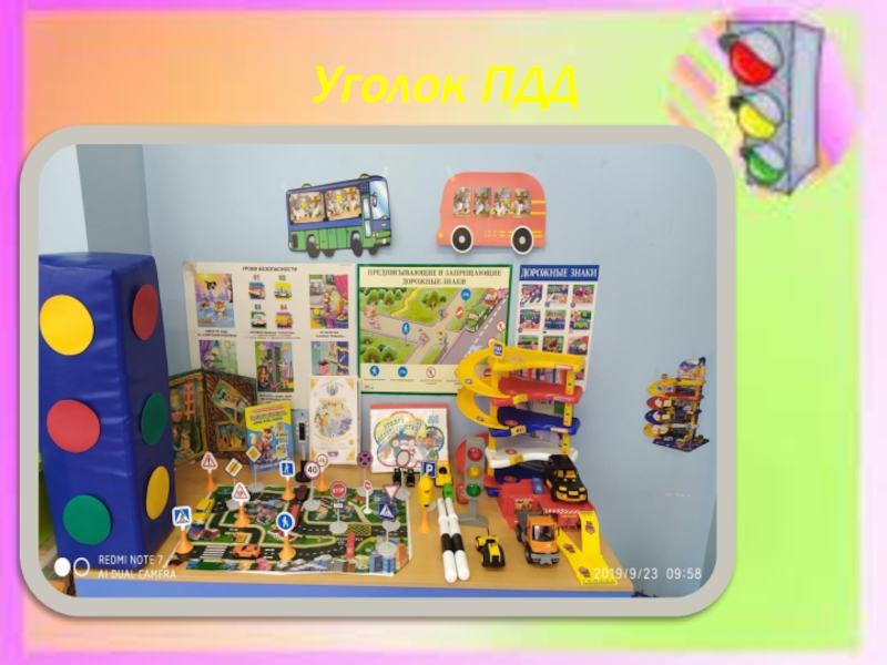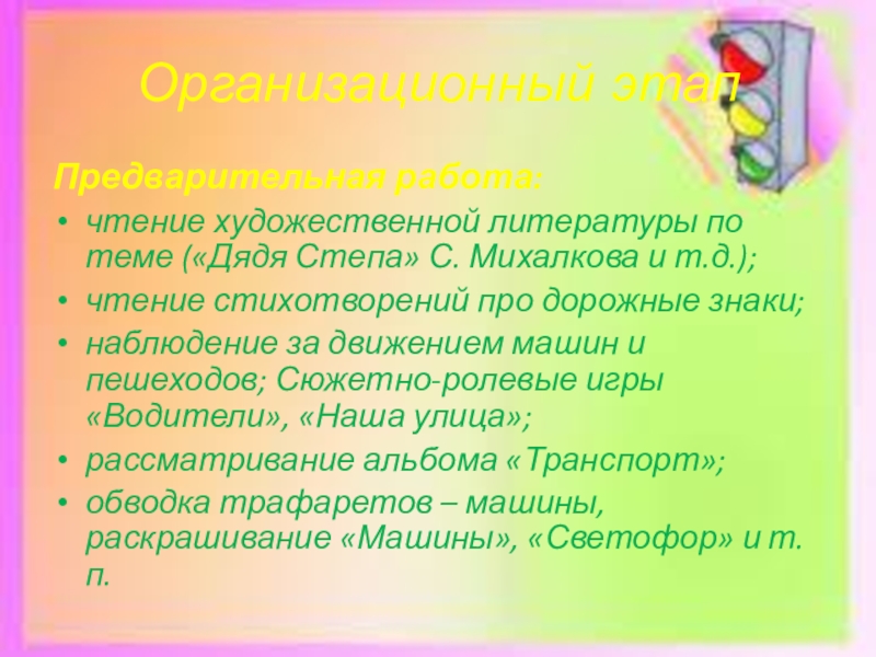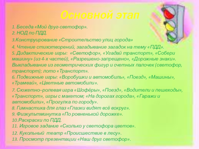 4. Активизировать словарь: светофор, зеленый (красный, желтый) цвет, руль, безопасность, дорога, транспорт, тротуар, проезжая часть, обочина, пешеходный переход, перекрёсток).