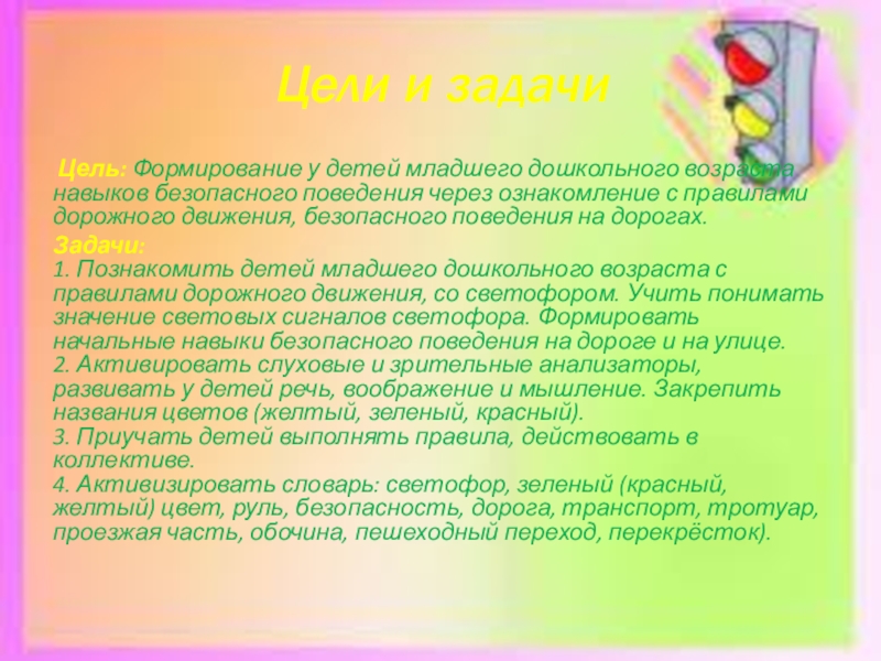1. Познакомить детей младшего дошкольного возраста с правилами дорожного движения, со светофором. Учить понимать значение световых сигналов светофора. Формировать начальные навыки безопасного поведения на дороге и на улице.