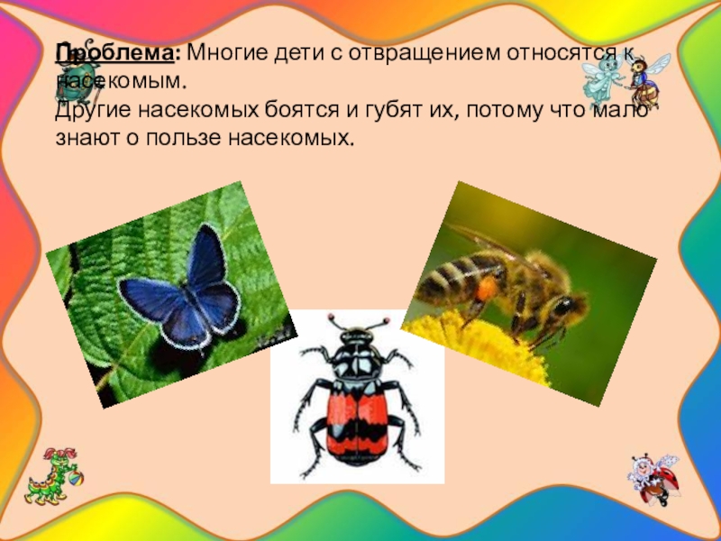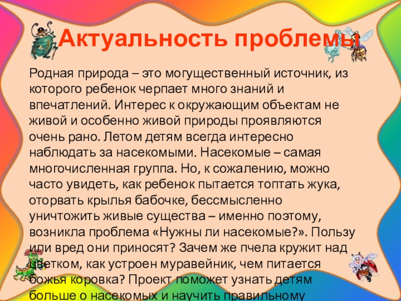 из которого ребенок черпает много знаний и впечатлений. Интерес к окружающим объектам не живой и особенно живой природы проявляются очень рано. Летом детям всегда интересно наблюдать за насекомыми. Насекомые – самая многочисленная группа. Но, к сожалению, можно часто увидеть, как ребенок пытается топтать жука, оторвать крылья бабочке, бессмысленно уничтожить живые существа – именно поэтому, возникла проблема «Нужны ли насекомые?». Пользу или вред они приносят? Зачем же пчела кружит над цветком, как устроен муравейник, чем питается божья коровка? Проект поможет узнать детям больше о насекомых и научить правильному отношению к ним.