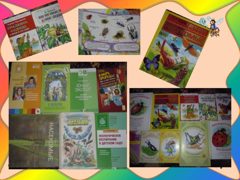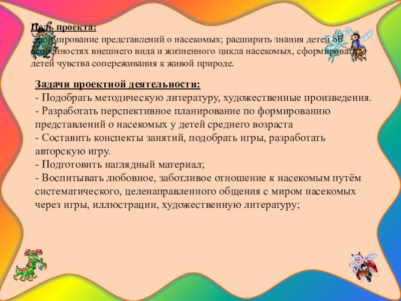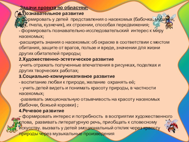 - Воспитывать любовное, заботливое отношение к насекомым путём систематического, целенаправленного общения с миром насекомых через игры, иллюстрации, художественную литературу;
