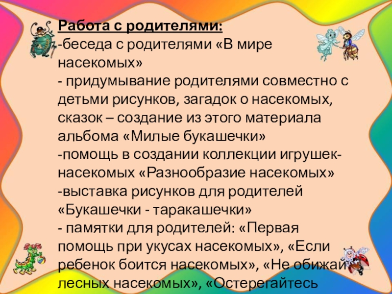 - памятки для родителей: «Первая помощь при укусах насекомых», «Если ребенок боится насекомых», «Не обижай лесных насекомых», «Остерегайтесь клещей»