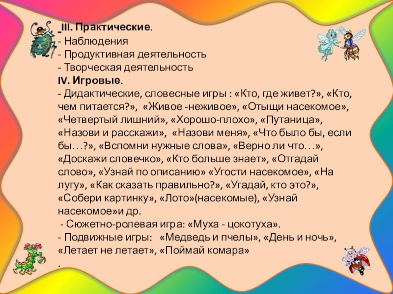 - Дидактические, словесные игры : «Кто, где живет?», «Кто, чем питается?», «Живое -неживое», «Отыщи насекомое», «Четвертый лишний», «Хорошо-плохо», «Путаница», «Назови и расскажи», «Назови меня», «Что было бы, если бы…?», «Вспомни нужные слова», «Верно ли что…», «Доскажи словечко», «Кто больше знает», «Отгадай слово», «Узнай по описанию» «Угости насекомое», «На лугу», «Как сказать правильно?», «Угадай, кто это?», «Собери картинку», «Лото»(насекомые), «Узнай насекомое»и др.