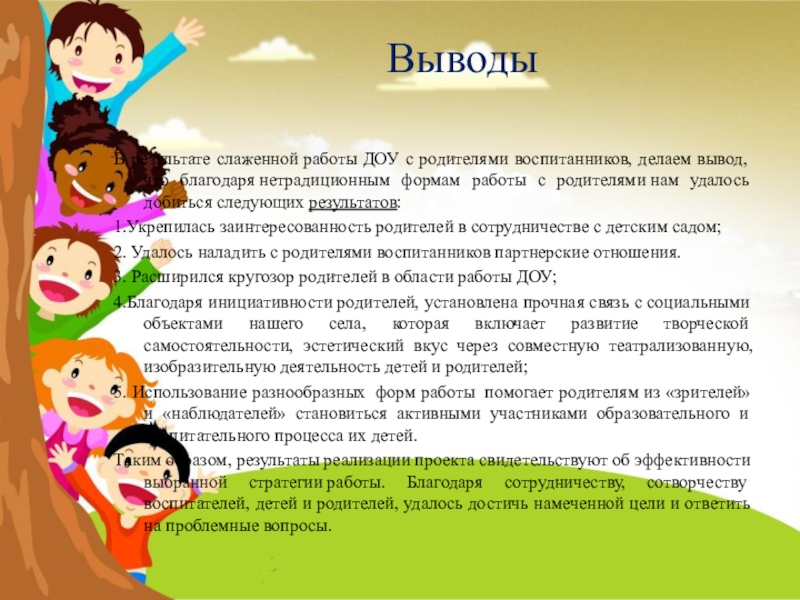 В результате слаженной работы ДОУ с родителями воспитанников, делаем вывод, что благодаря нетрадиционным
