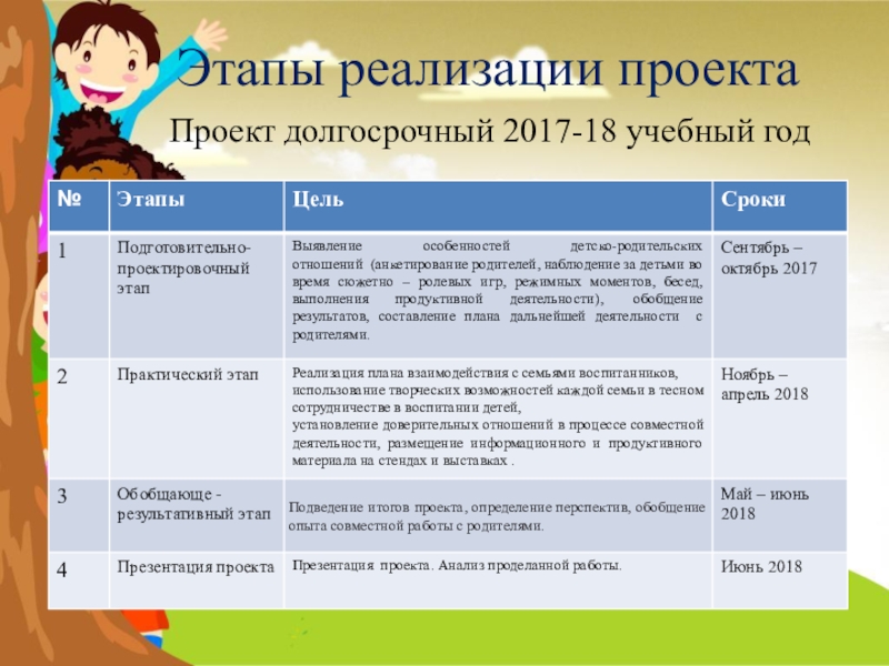 В основу данного проекта положена основная педагогическая идея – применение инновационных методов и технологий по работе с родителями, таких как технология сотрудничества, технология коллективного творческого дела, игровая технология для изменения внутренней картины мира уже существующей концепции воспитанников, педагогов, родителей с целью сохранения и укрепления психического и психологического здоровья всех участников воспитательного и образовательного процесса.