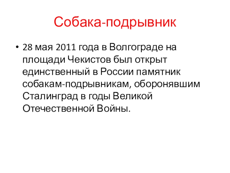единственный в России памятник собакам-подрывникам, оборонявшим Сталинград в годы Великой Отечественной Войны.