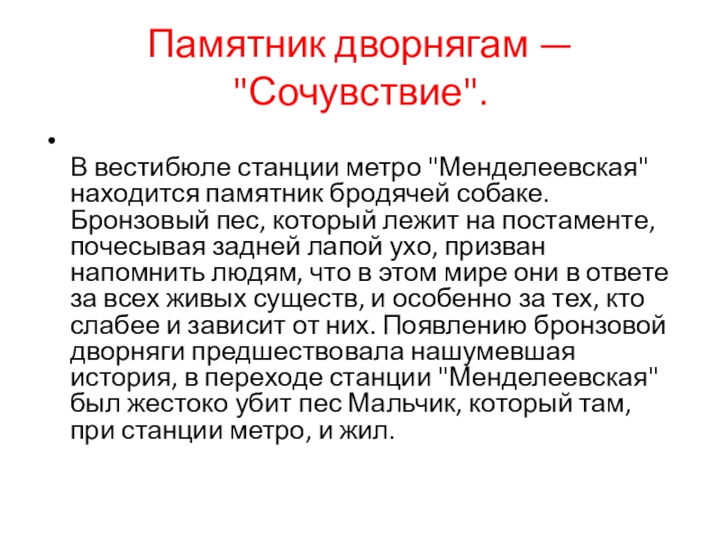 собаке. Бронзовый пес, который лежит на постаменте, почесывая задней лапой ухо, призван напомнить людям, что в этом мире они в ответе за всех живых существ, и особенно за тех, кто слабее и зависит от них. Появлению бронзовой дворняги предшествовала нашумевшая история, в переходе станции "Менделеевская" был жестоко убит пес Мальчик, который там, при станции метро, и жил.