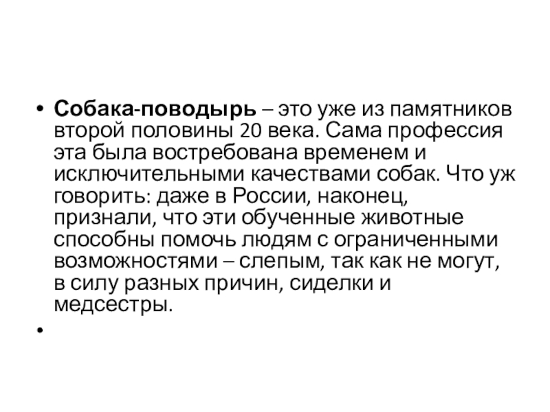 Слайд 29Собака-поводырь – это уже из памятников второй половины 20 века. Сама профессия