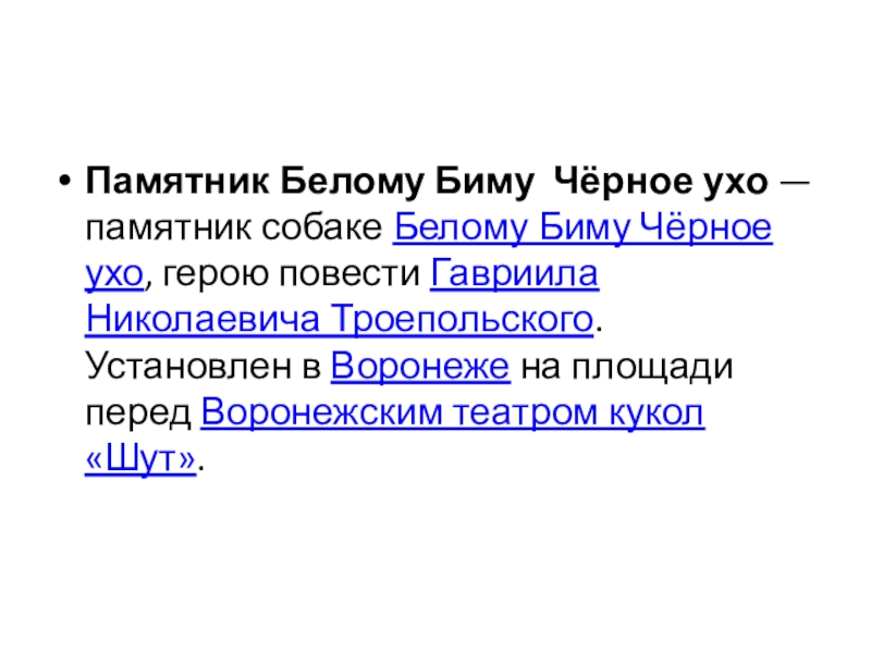 Слайд 19Памятник Белому Биму Чёрное ухо — памятник собаке Белому Биму Чёрное ухо, герою