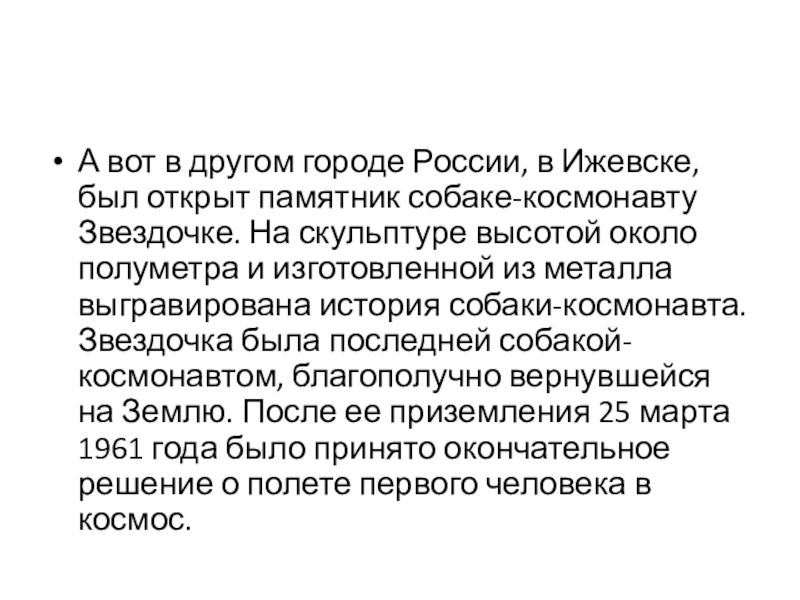 Звездочка была последней собакой-космонавтом, благополучно вернувшейся на Землю. После ее приземления 25 марта 1961 года было принято окончательное решение о полете первого человека в космос.