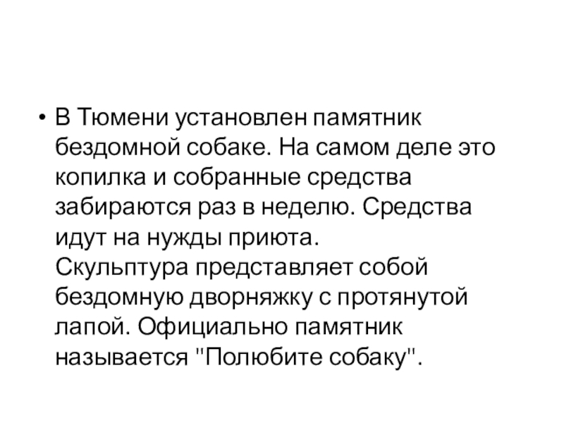 Слайд 11В Тюмени установлен памятник бездомной собаке. На самом деле это копилка
