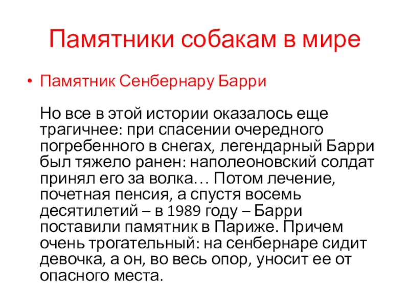 еще трагичнее: при спасении очередного погребенного в снегах, легендарный Барри был тяжело ранен: наполеоновский солдат принял его за волка… Потом лечение, почетная пенсия, а спустя восемь десятилетий – в 1989 году – Барри поставили памятник в Париже. Причем очень трогательный: на сенбернаре сидит девочка, а он, во весь опор, уносит ее от опасного места.