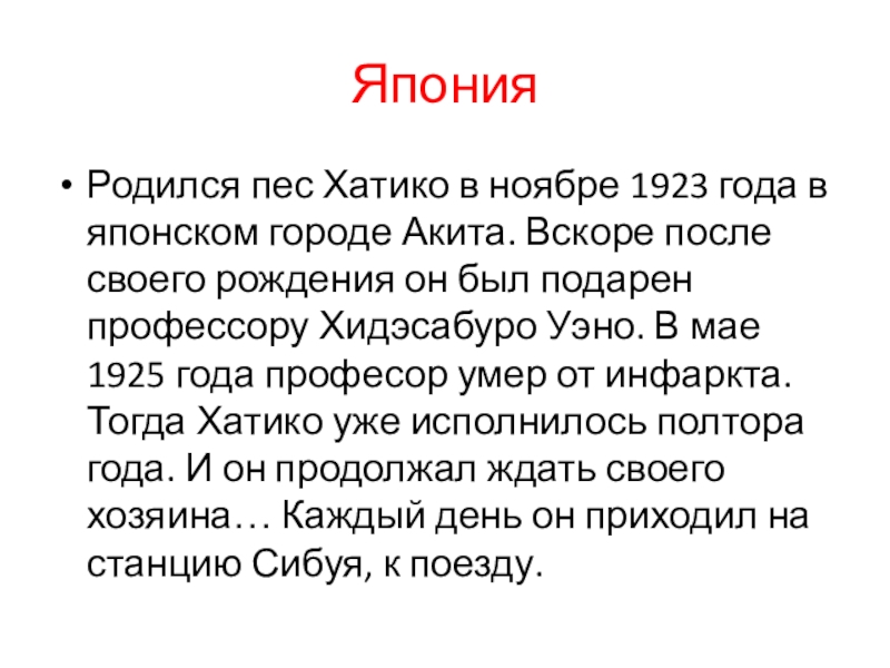 Вскоре после своего рождения он был подарен профессору Хидэсабуро Уэно. В мае 1925 года професор умер от инфаркта. Тогда Хатико уже исполнилось полтора года. И он продолжал ждать своего хозяина… Каждый день он приходил на станцию Сибуя, к поезду.
