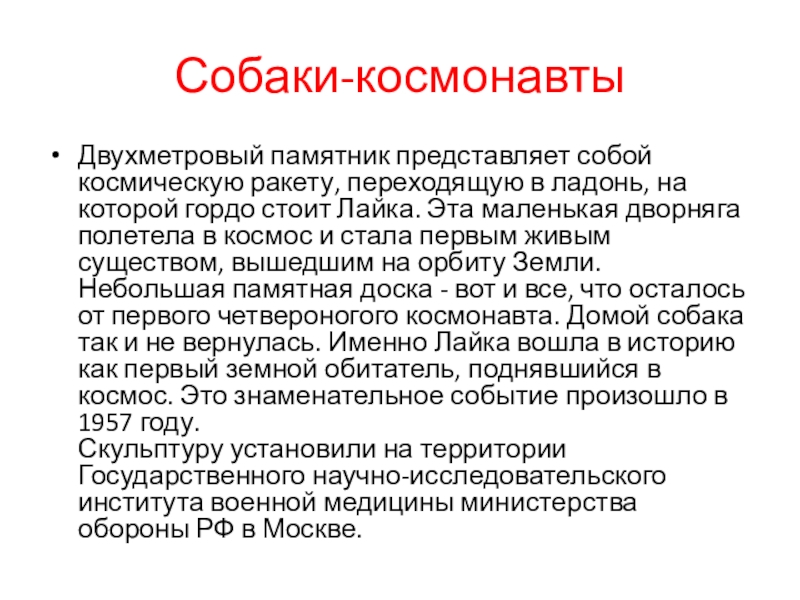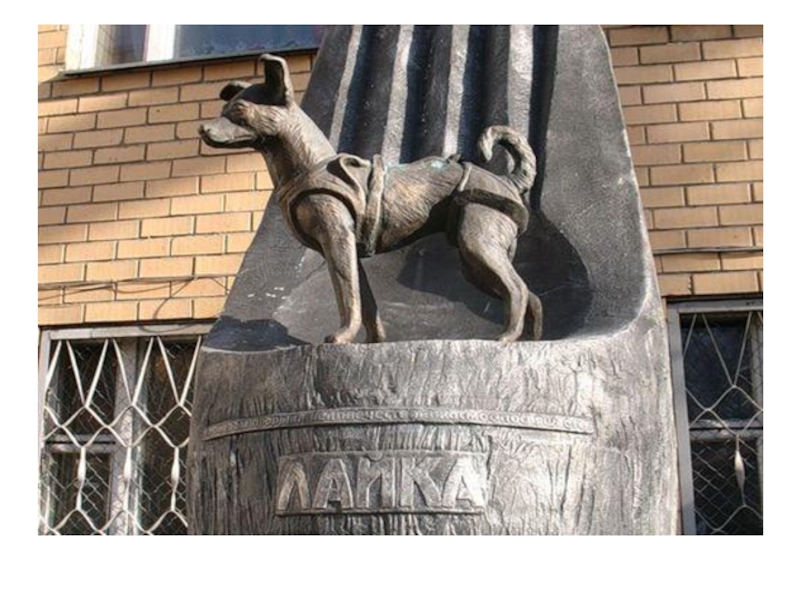гордо стоит Лайка. Эта маленькая дворняга полетела в космос и стала первым живым существом, вышедшим на орбиту Земли.