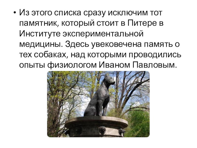в Институте экспериментальной медицины. Здесь увековечена память о тех собаках, над которыми проводились опыты физиологом Иваном Павловым.