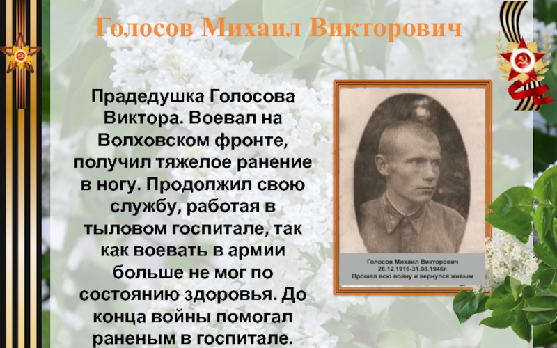 Слайд 4Прадедушка Голосова Виктора. Воевал на Волховском фронте, получил тяжелое ранение в