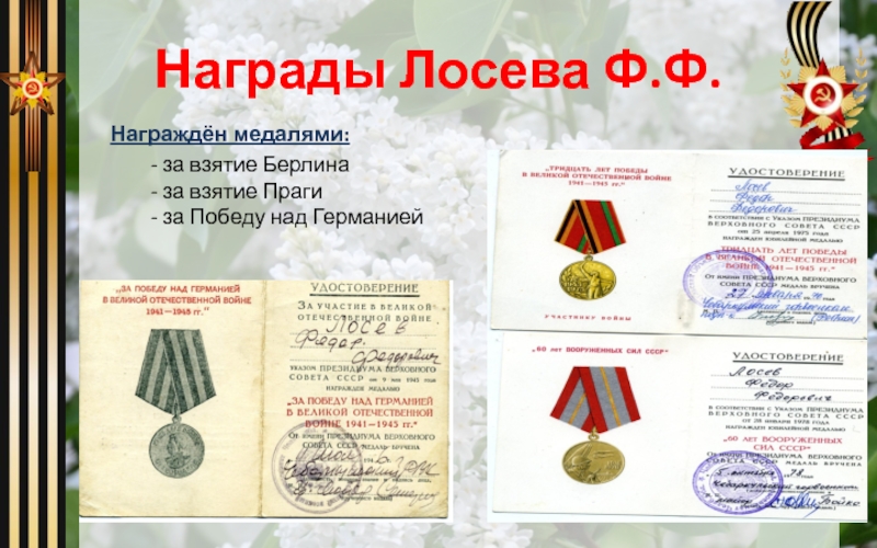 Слайд 10Награды Лосева Ф.Ф.