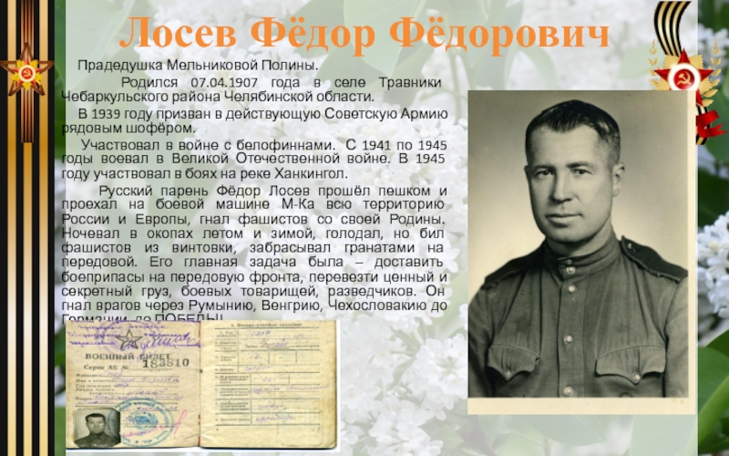 Русский парень Фёдор Лосев прошёл пешком и проехал на боевой машине М-Ка всю территорию России и Европы, гнал фашистов со своей Родины. Ночевал в окопах летом и зимой, голодал, но бил фашистов из винтовки, забрасывал гранатами на передовой. Его главная задача была – доставить боеприпасы на передовую фронта, перевезти ценный и секретный груз, боевых товарищей, разведчиков. Он гнал врагов через Румынию, Венгрию, Чехословакию до Германии, до ПОБЕДЫ!