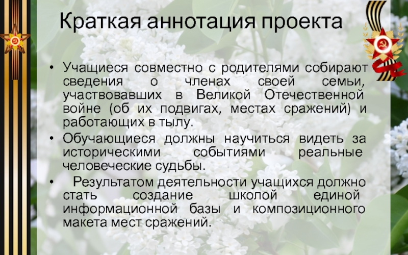 Результатом деятельности учащихся должно стать создание школой единой информационной базы и композиционного макета мест сражений.