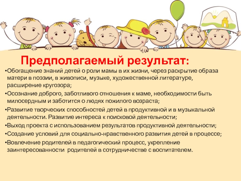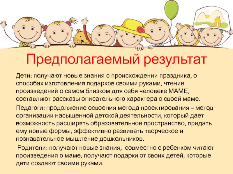 Родители: получают новые знания, совместно с ребенком читают произведения о маме, получают подарки от своих детей, которые дети создают своими руками.