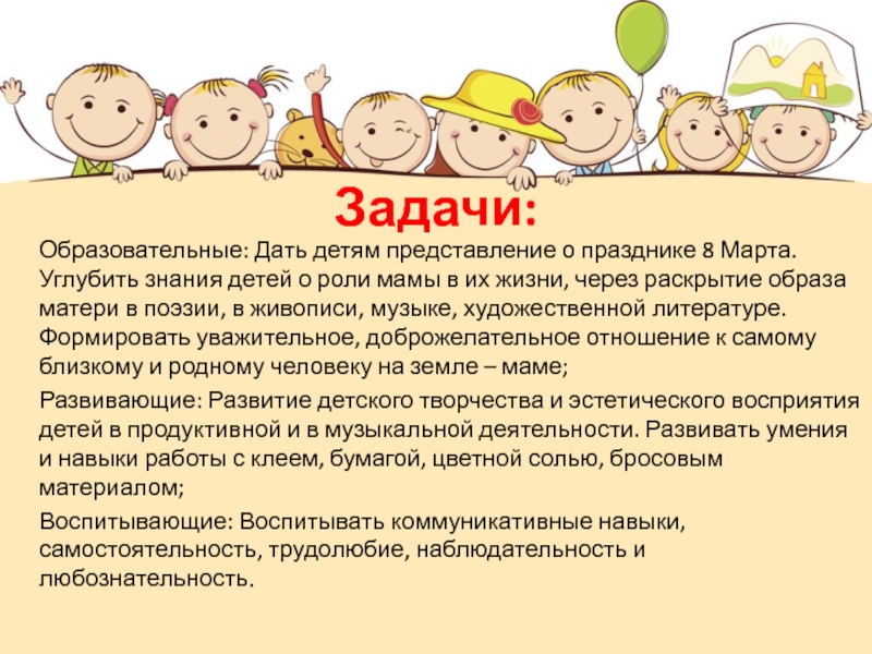 Образовательные: Дать детям представление о празднике 8 Марта. Углубить знания детей