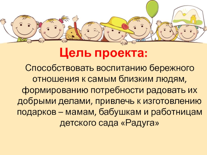 радовать их добрыми делами, привлечь к изготовлению подарков – мамам, бабушкам и работницам детского сада «Радуга»