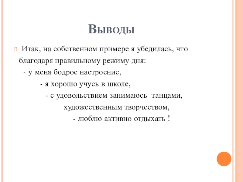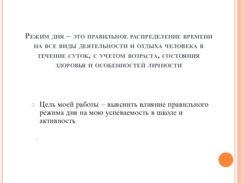 Цель моей работы – выяснить влияние правильного режима дня на мою успеваемость в школе и активность