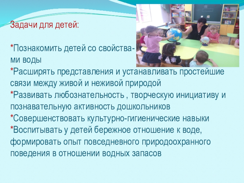 Слайд 3Задачи для детей: *Познакомить детей со свойства- ми воды *Расширять представления и устанавливать простейшие