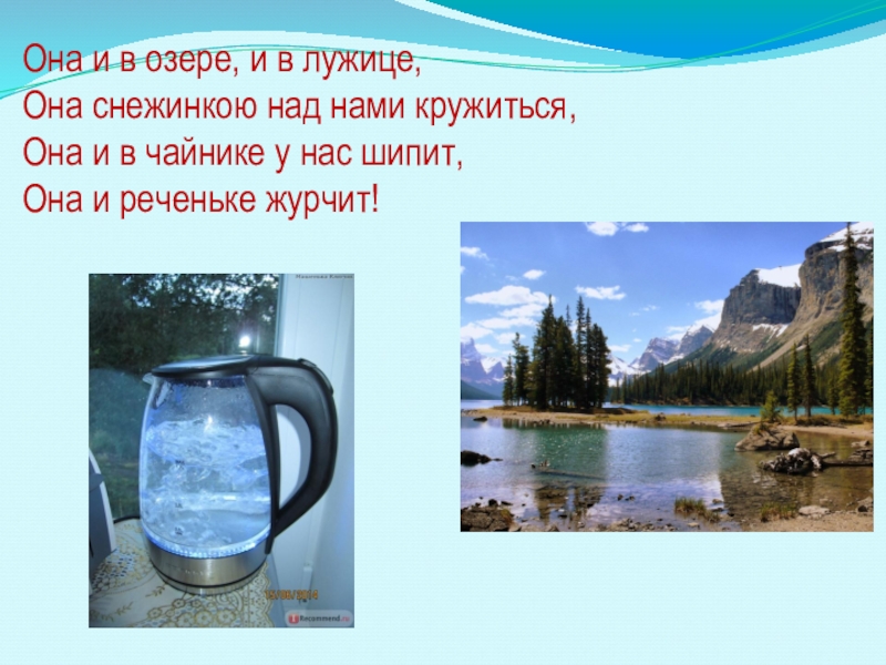 Она и в озере, и в лужице, Она снежинкою над нами кружиться, Она и в чайнике у