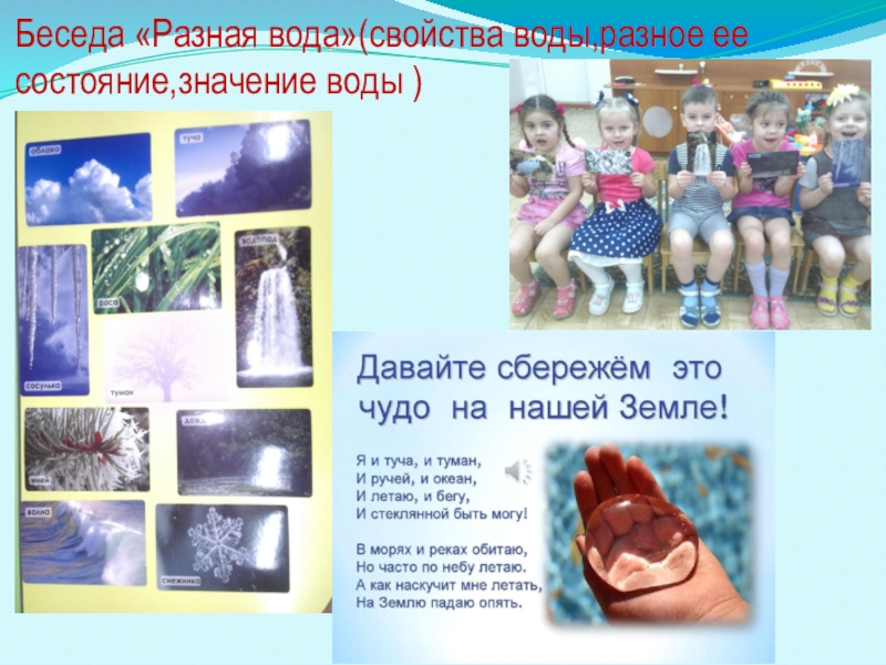 Слайд 16Беседа «Разная вода»(свойства воды,разное ее состояние,значение воды )