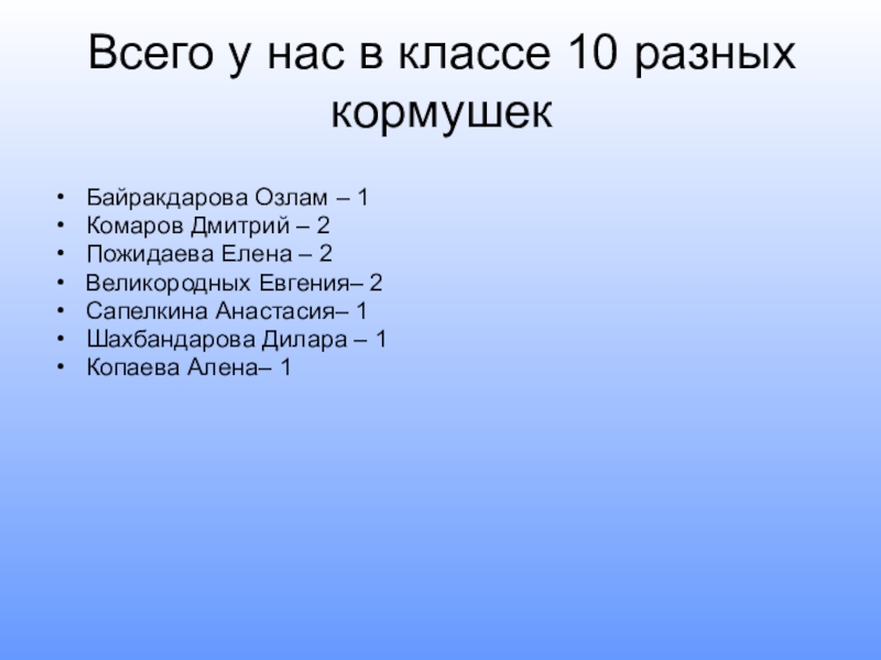 Слайд 36Всего у нас в классе 10 разных кормушек