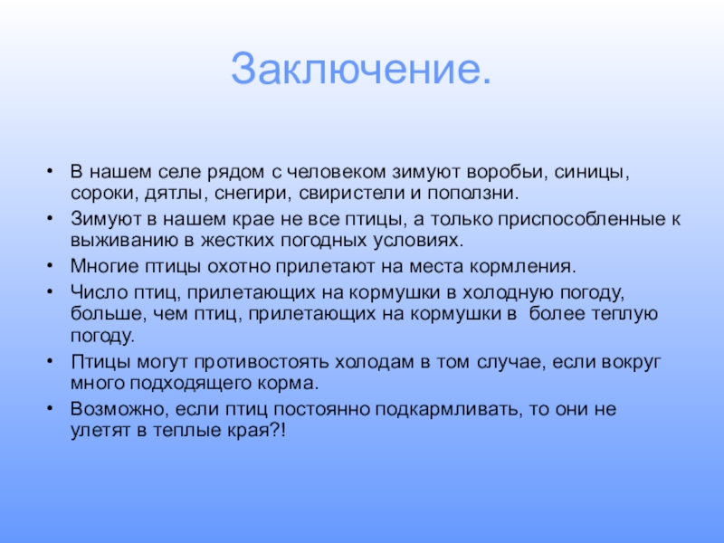 Изучить, какие птицы остаются у нас зимовать.