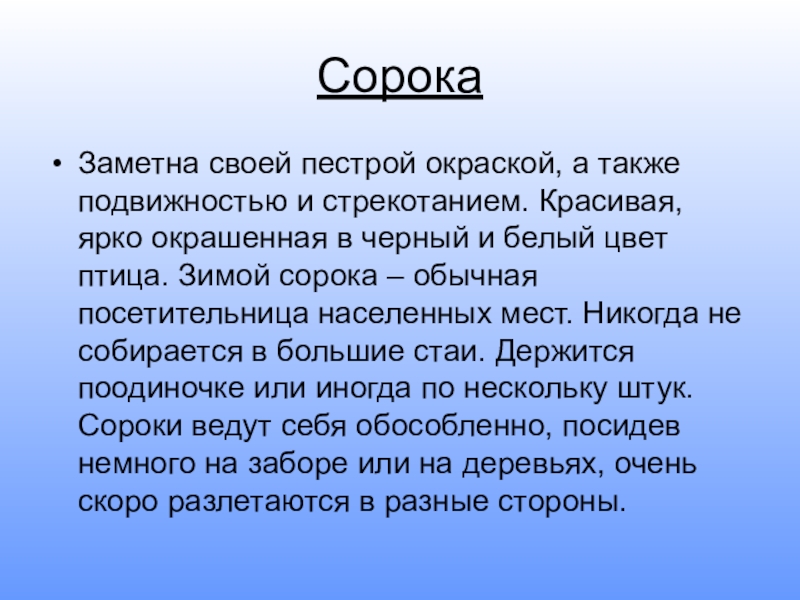 окрашенная в черный и белый цвет птица. Зимой сорока – обычная посетительница населенных мест. Никогда не собирается в большие стаи. Держится поодиночке или иногда по нескольку штук. Сороки ведут себя обособленно, посидев немного на заборе или на деревьях, очень скоро разлетаются в разные стороны.