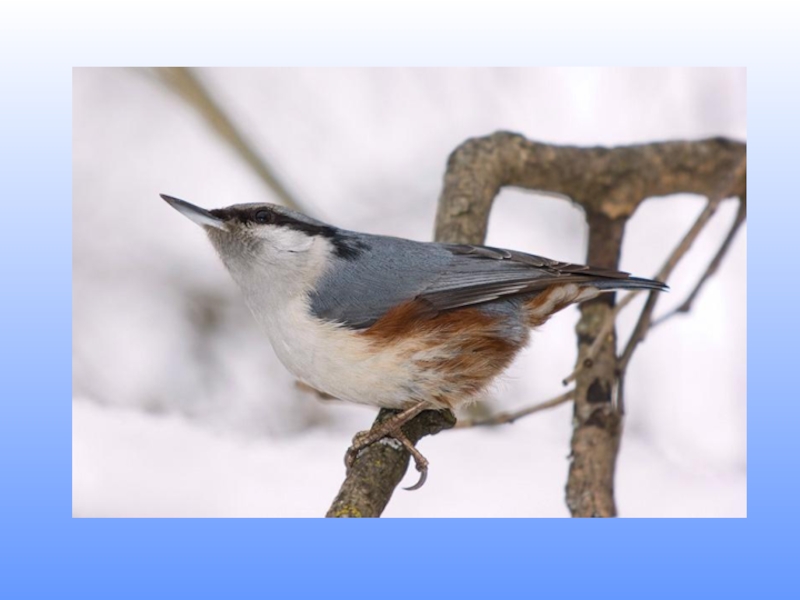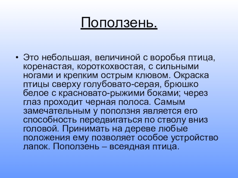 и крепким острым клювом. Окраска птицы сверху голубовато-серая, брюшко белое с красновато-рыжими боками; через глаз проходит черная полоса. Самым замечательным у поползня является его способность передвигаться по стволу вниз головой. Принимать на дереве любые положения ему позволяет особое устройство лапок. Поползень – всеядная птица.