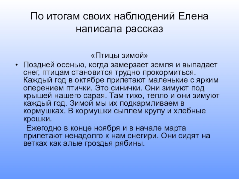 Слайд 41По итогам своих наблюдений Елена написала рассказ