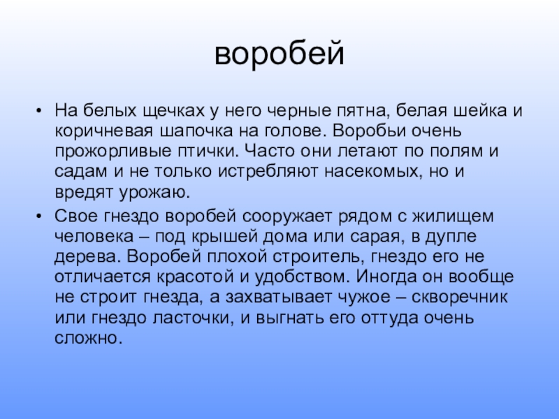 шапочка на голове. Воробьи очень прожорливые птички. Часто они летают по полям и садам и не только истребляют насекомых, но и вредят урожаю.