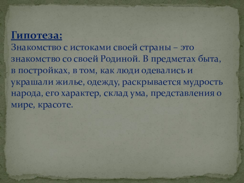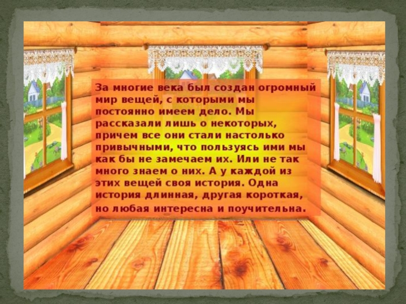 В предметах быта, в постройках, в том, как люди одевались и украшали жилье, одежду, раскрывается мудрость народа, его характер, склад ума, представления о мире, красоте.
