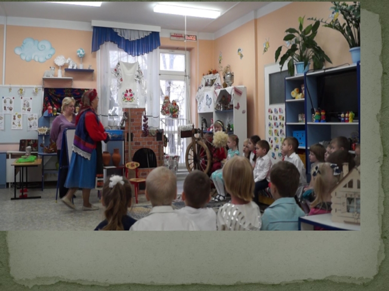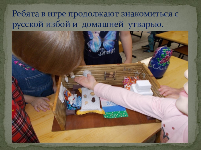 Слайд 41Ребята в игре продолжают знакомиться с русской избой и домашней утварью.
